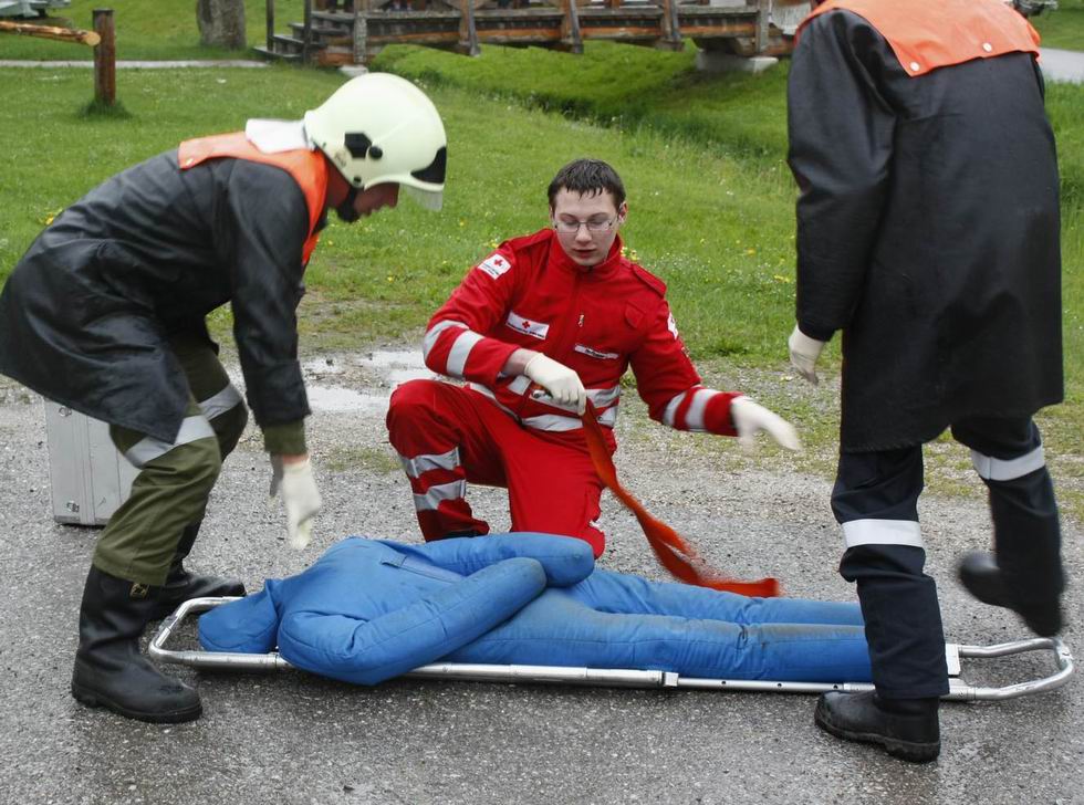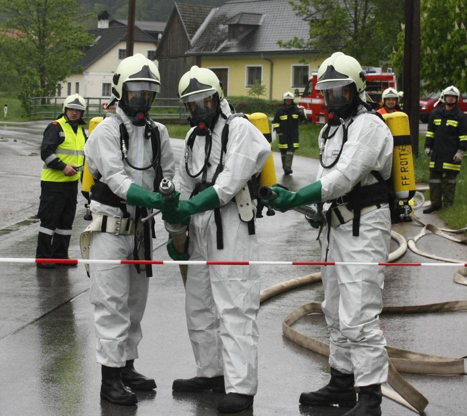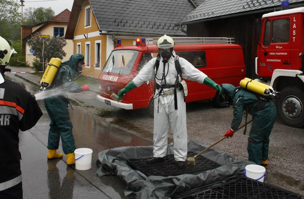 Während die FF-Kirchbach, unter Einsatz von schwerem Atemschutz, mit der Rettung der Personen aus dem verunfallten PKW begann, wurde das Gebiet um den inszenierten Zusammenstoß abgesperrt. Die Feuerwehrmänner aus Lembach errichteten eine Ölsperre im nahe gelegenen Bach. Mittlerweile waren die restlichen Teilnehmer mit dem Aufbau der Brandsicherung und Sicherstellung der Wasserversorgung beschäftigt. Kurz nachdem die "geretteten" Dummies an das Rote Kreuz zur Erstversorgung übergeben werden konnten, traf der "Schadstoffzug 22 Zwettl" mit seinen Gerätschaften am Übungsort ein. Die Anzahl von 11 Fahrzeugen und mehr als 80 eingesetzten Männern verdeutlichten von welchen Gefahren bei der Schadstoffbekämpfung im Erstfall ausgegangen werden muss.